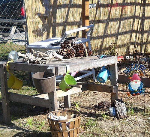A well- designed “messy materials” area can encourage children to use their imaginations, experiment with a variety of natural objects, practice carrying heavy objects, and feel a sense of accomplishment and personal mastery over the environment. ~ Learning With Nature Idea Book